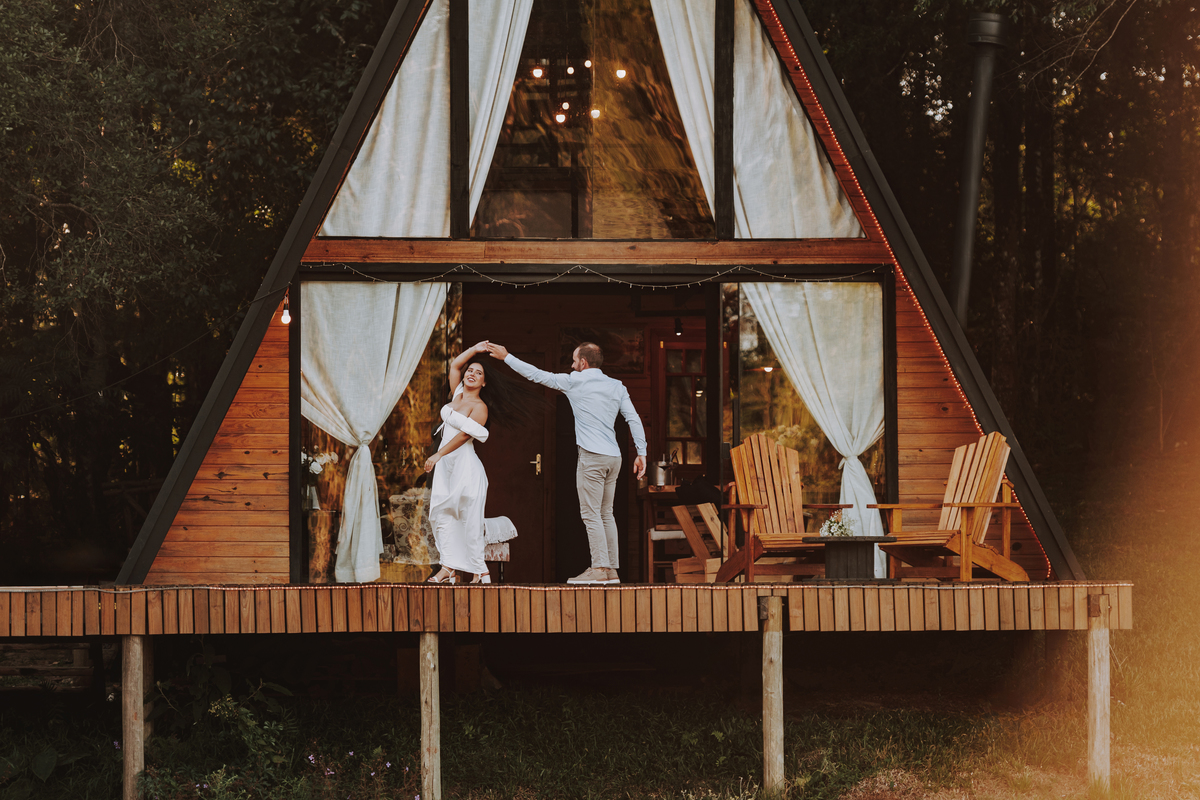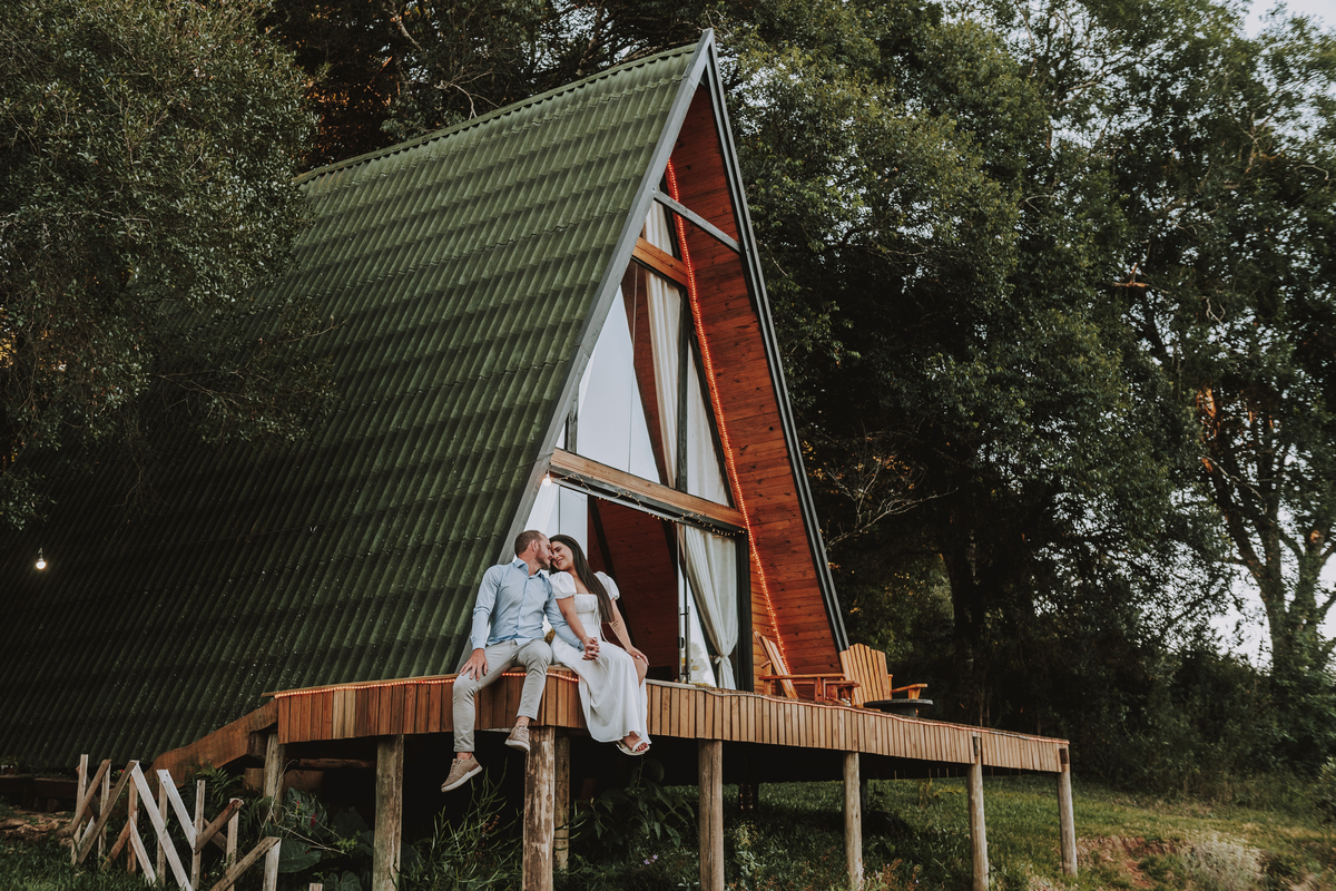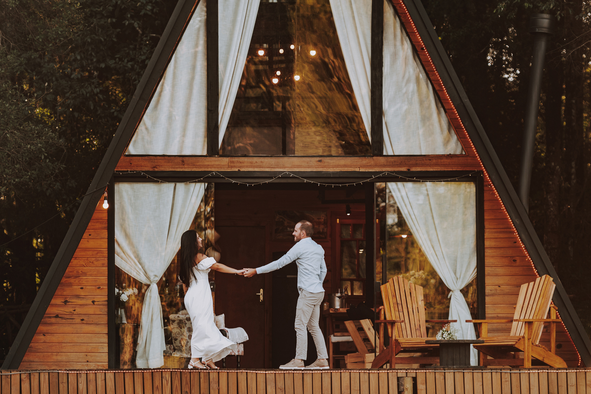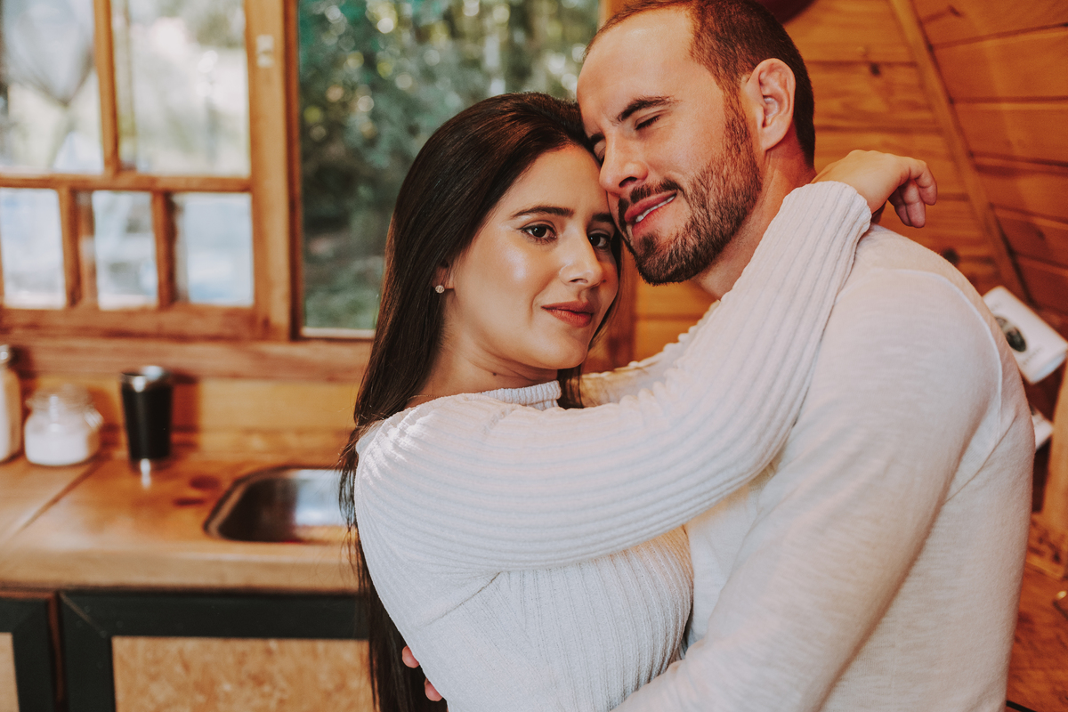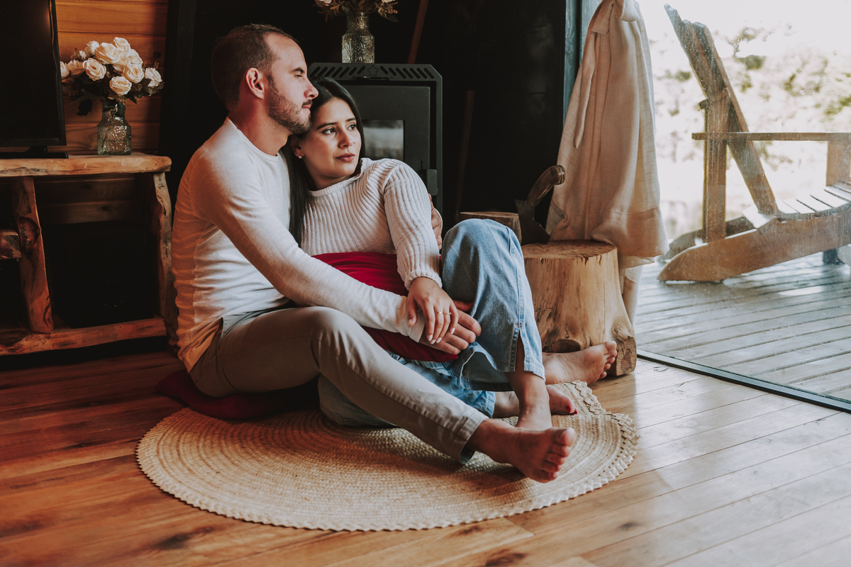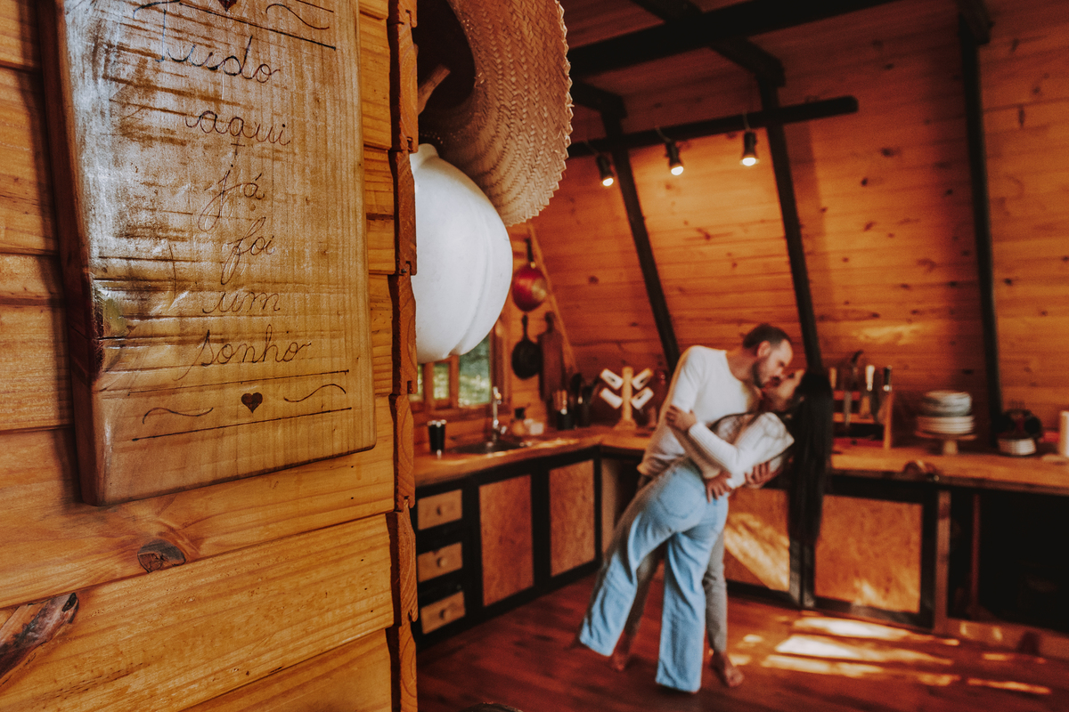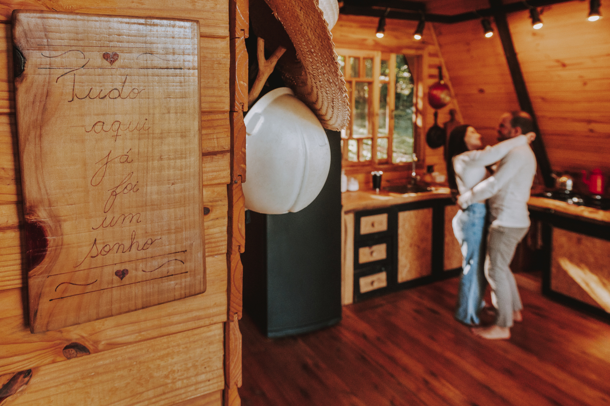 Eles escolheram como cenário a cabana que construíram juntos, com as próprias mãos e muitos sonhos. Um refúgio feito de madeira, fé e carinho. Ali, cada objeto tem história: os móveis esculpidos pelo Gabriel, os símbolos de religiosidade que decoram com leveza, os cantinhos que guardam memórias e significados. É mais que um lugar — é um espelho da vida que estão construindo lado a lado.