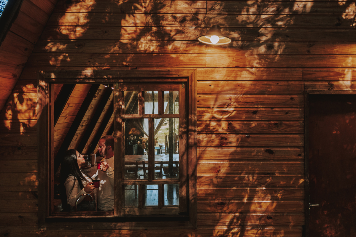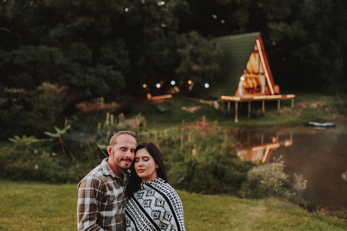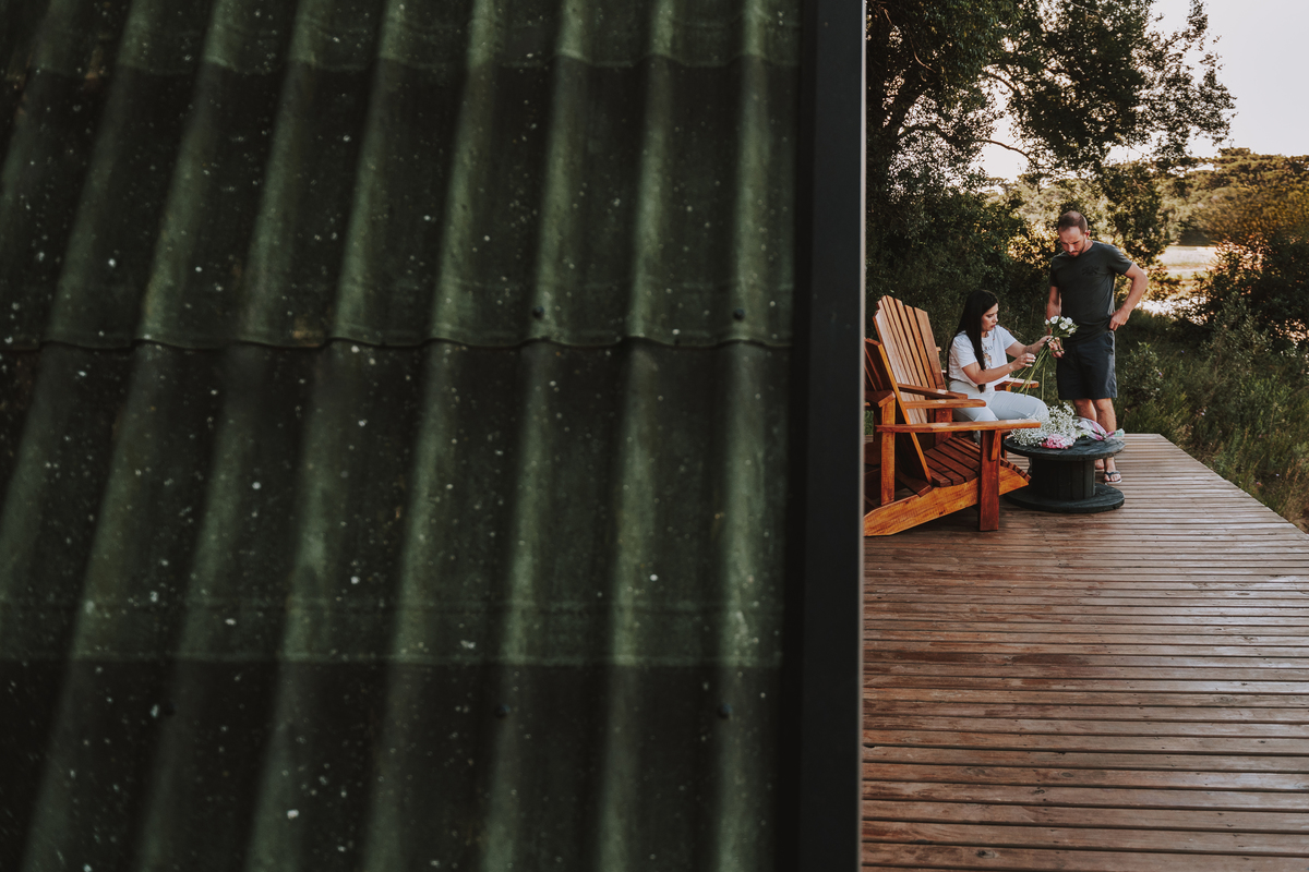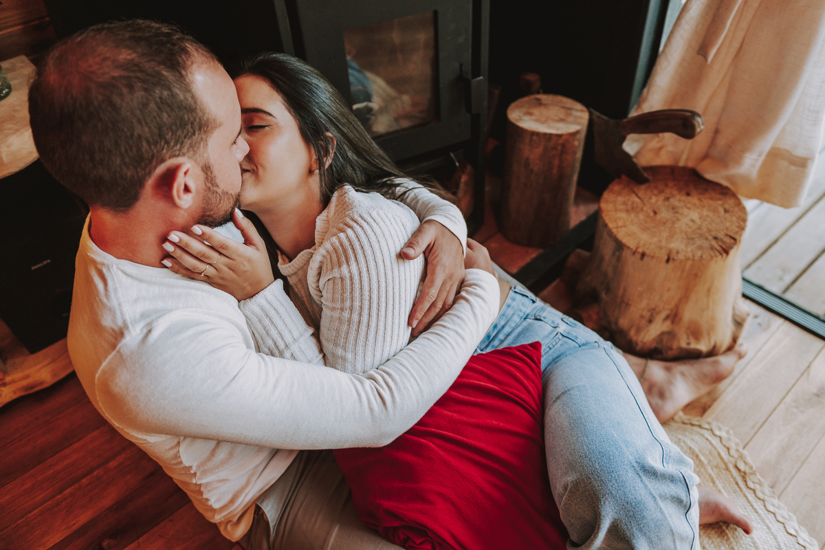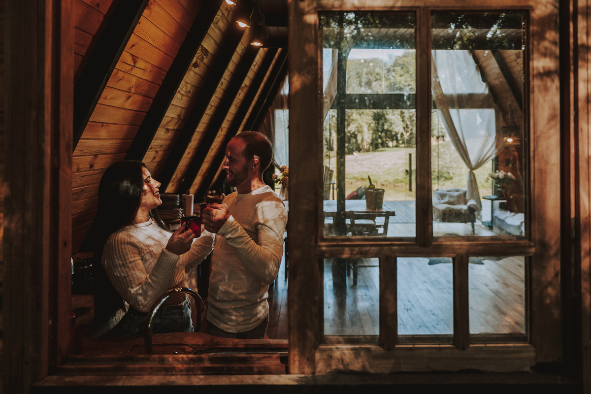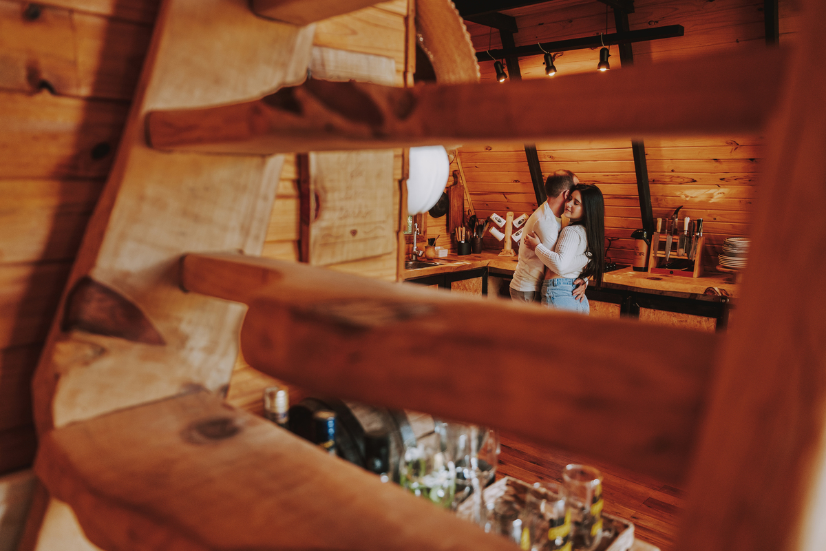 Eles escolheram como cenário a cabana que construíram juntos, com as próprias mãos e muitos sonhos. Um refúgio feito de madeira, fé e carinho. Ali, cada objeto tem história: os móveis esculpidos pelo Gabriel, os símbolos de religiosidade que decoram com leveza, os cantinhos que guardam memórias e significados. É mais que um lugar — é um espelho da vida que estão construindo lado a lado.