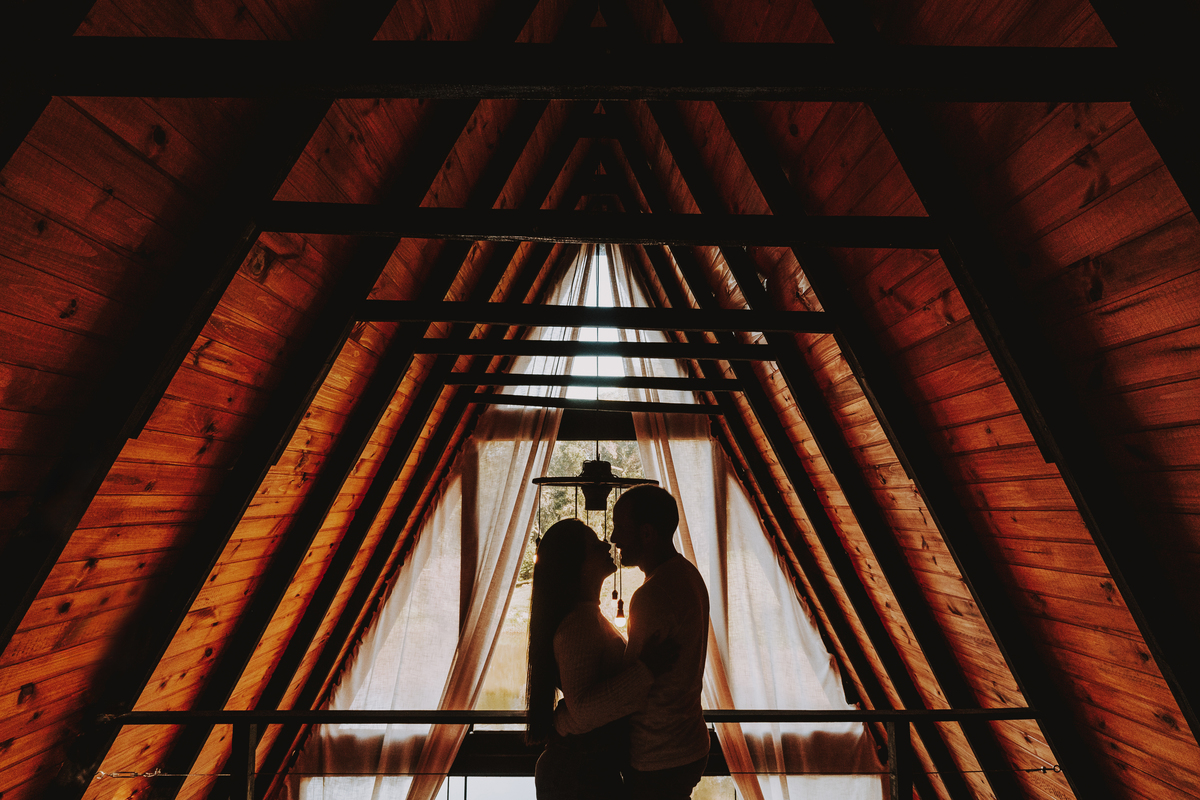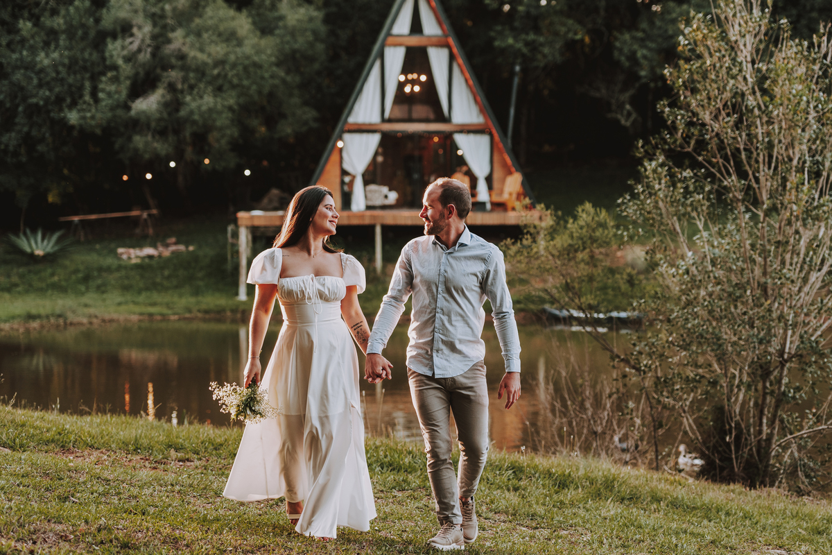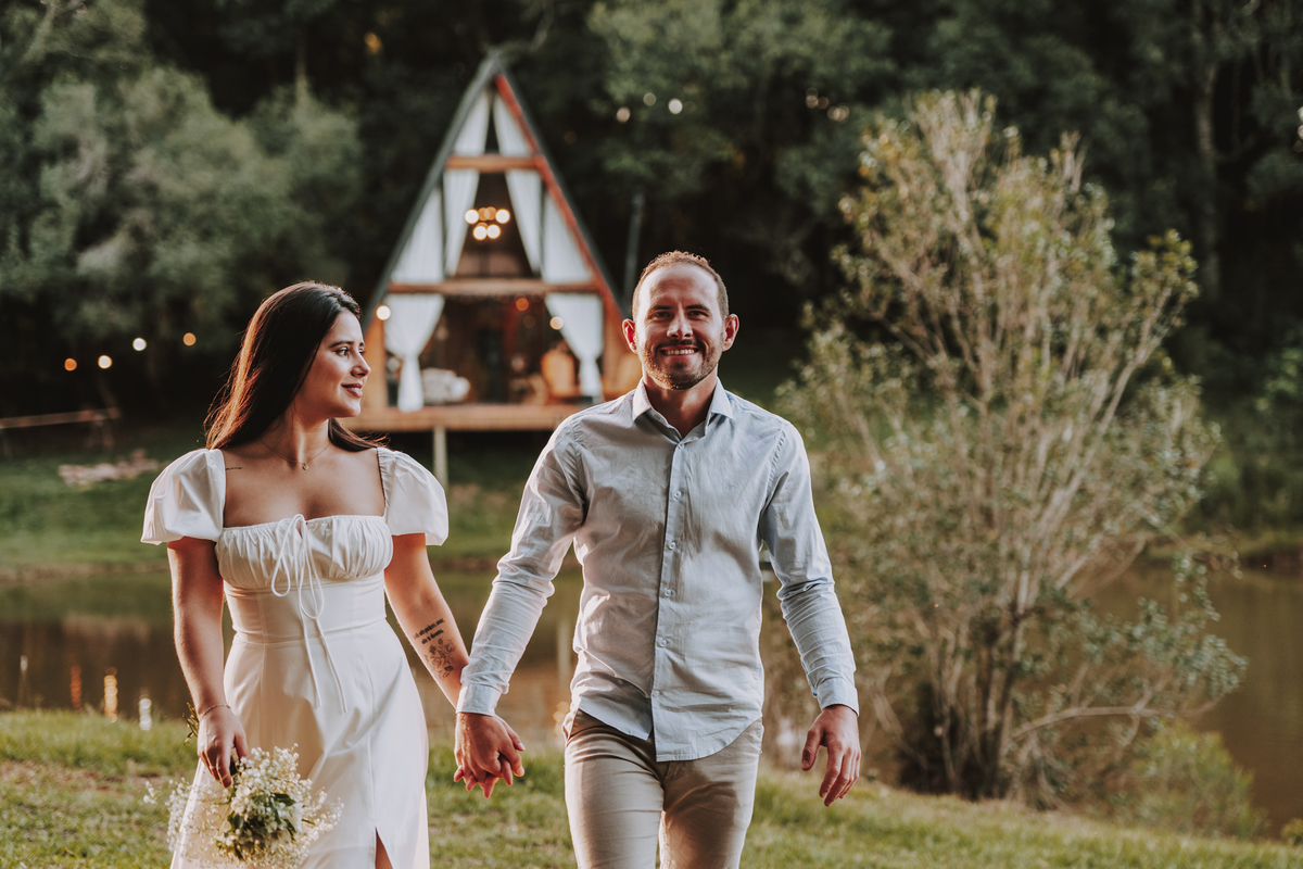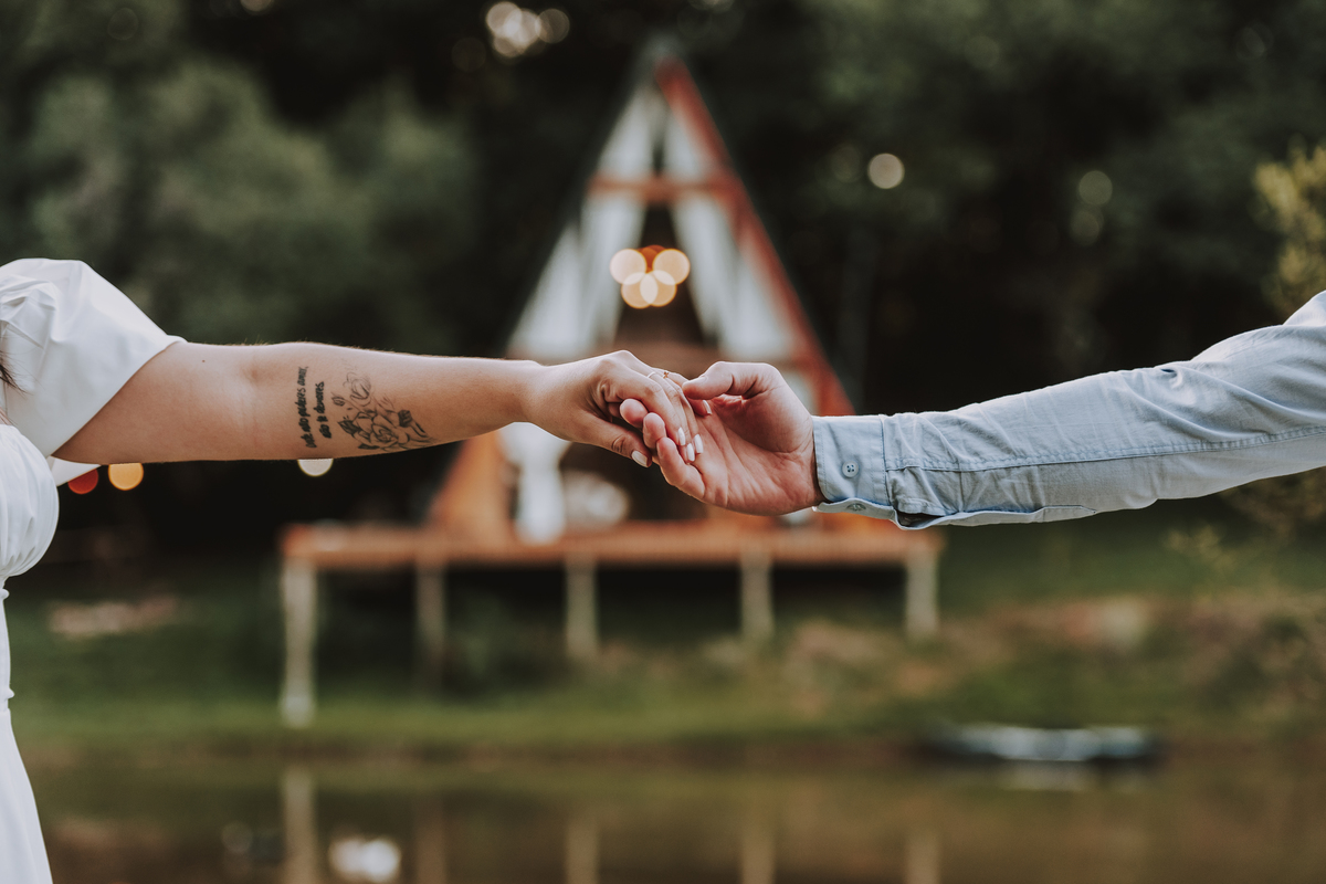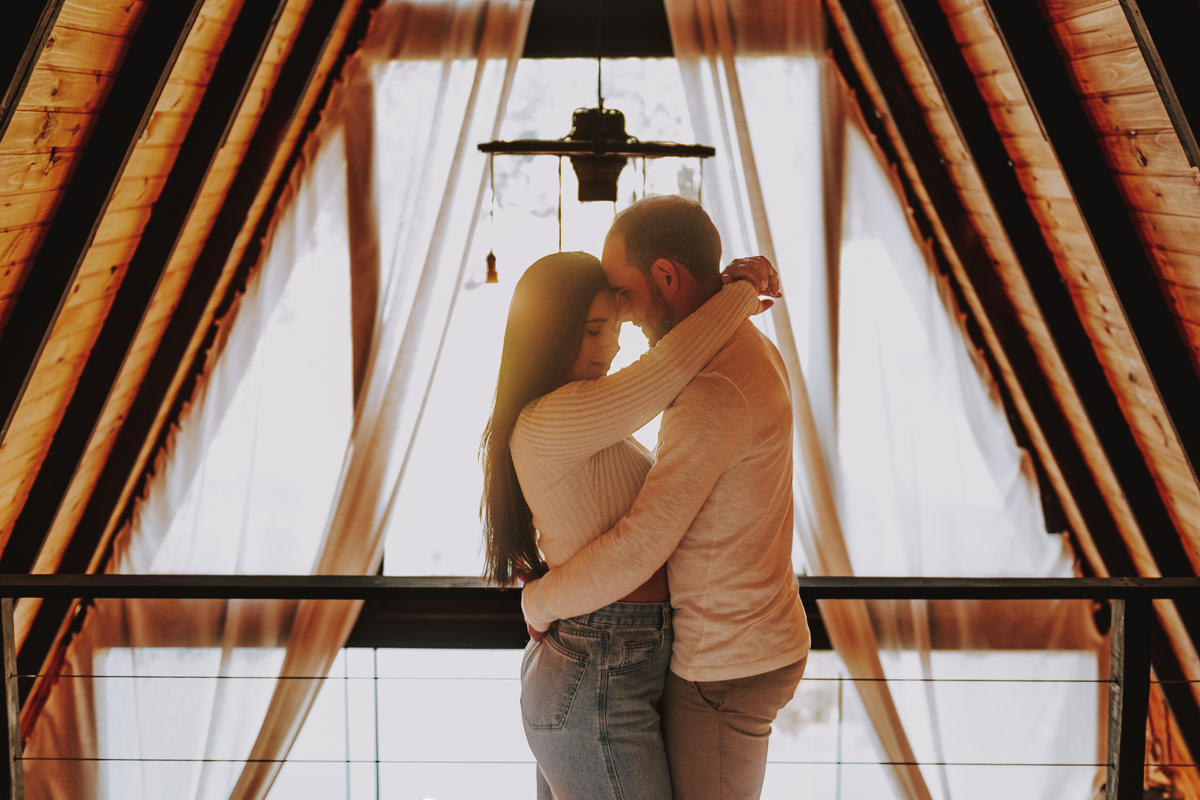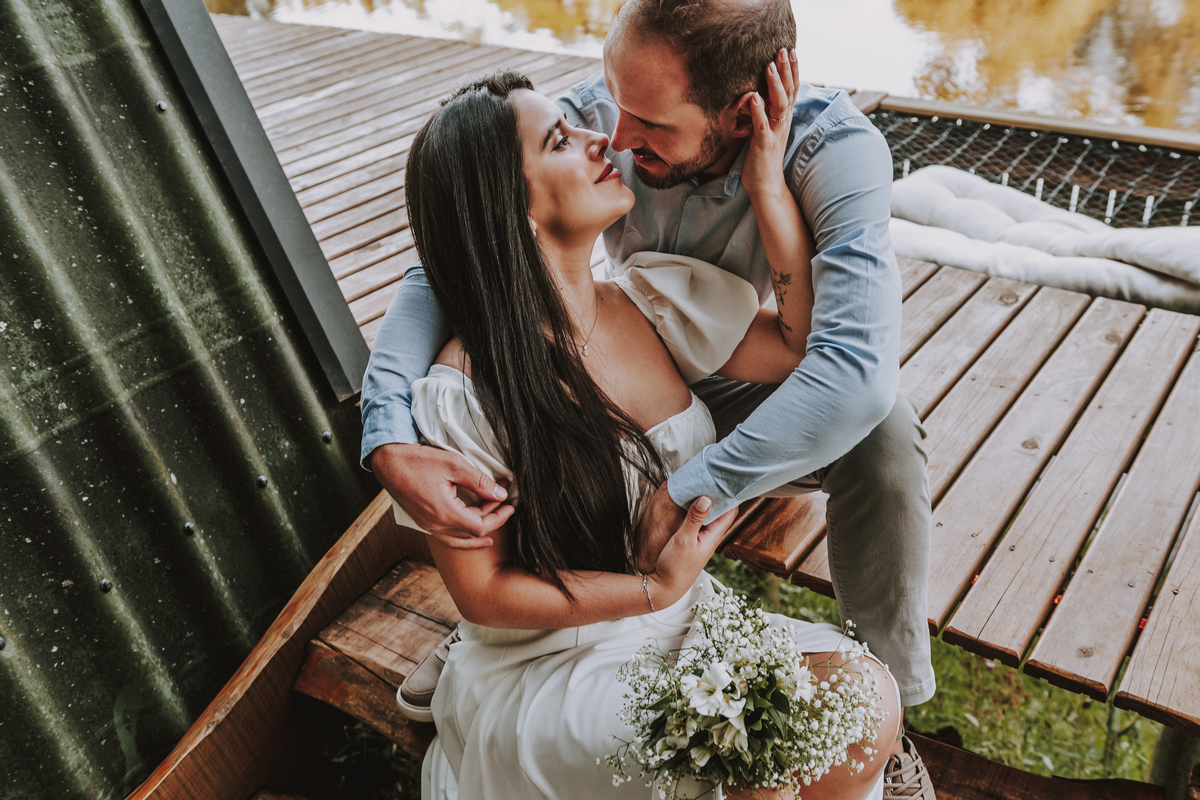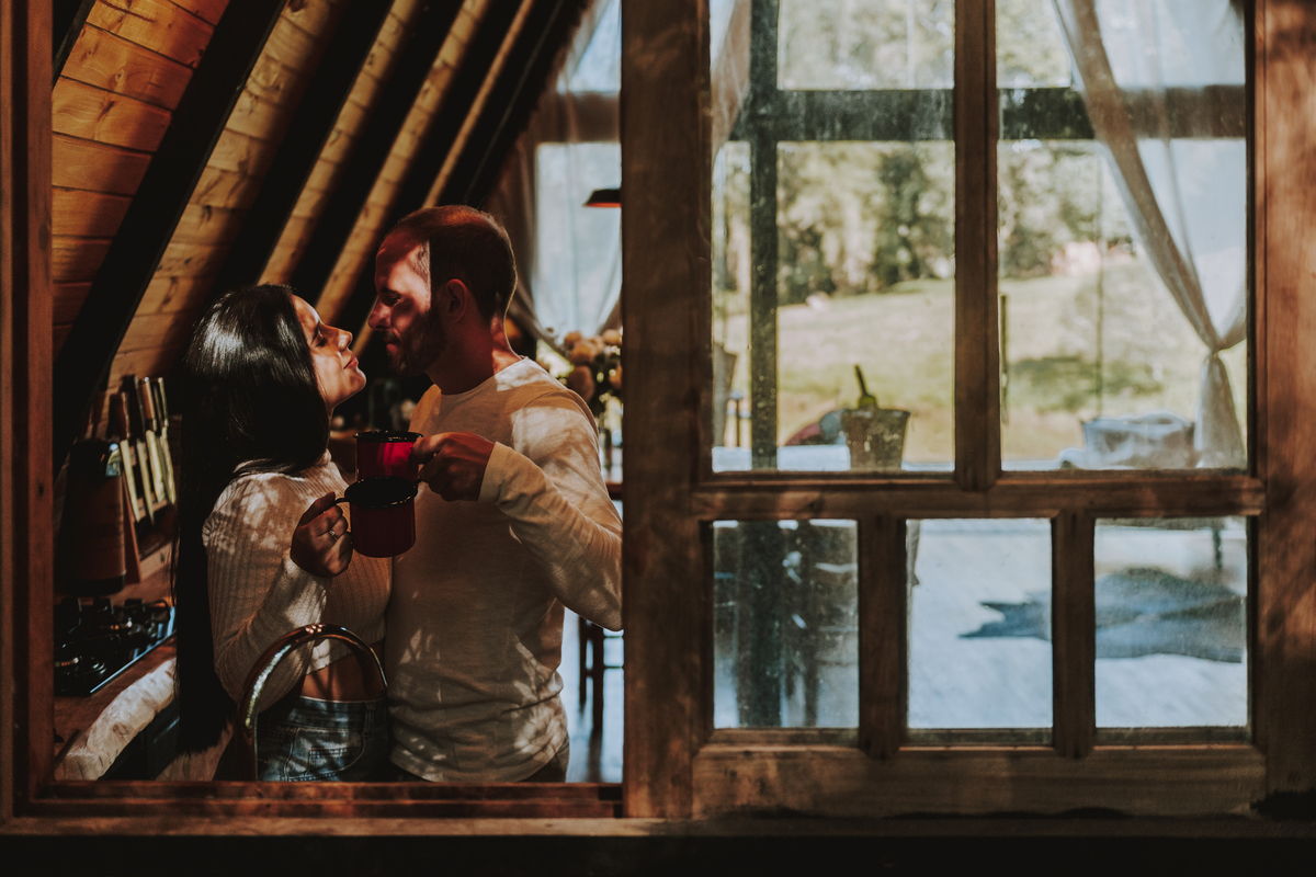 Eles escolheram como cenário a cabana que construíram juntos, com as próprias mãos e muitos sonhos. Um refúgio feito de madeira, fé e carinho. Ali, cada objeto tem história: os móveis esculpidos pelo Gabriel, os símbolos de religiosidade que decoram com leveza, os cantinhos que guardam memórias e significados. É mais que um lugar — é um espelho da vida que estão construindo lado a lado.