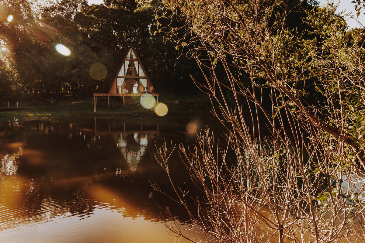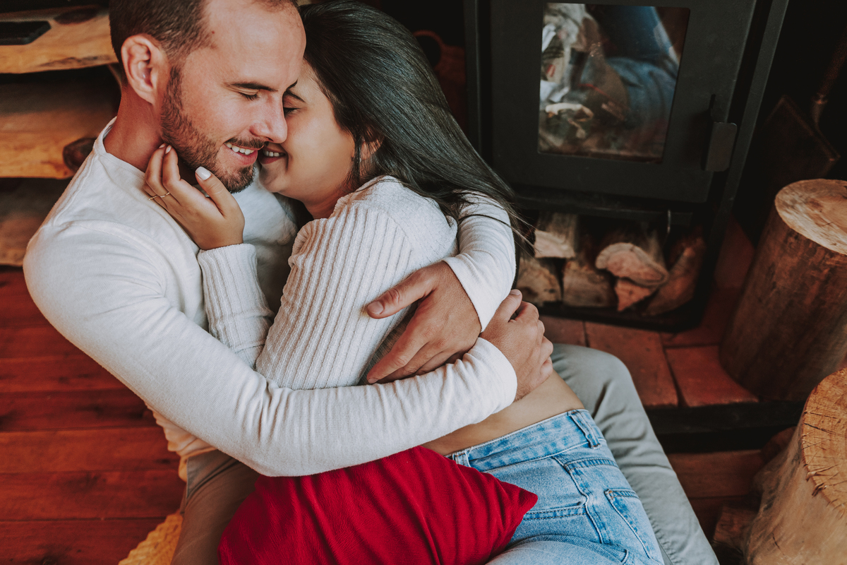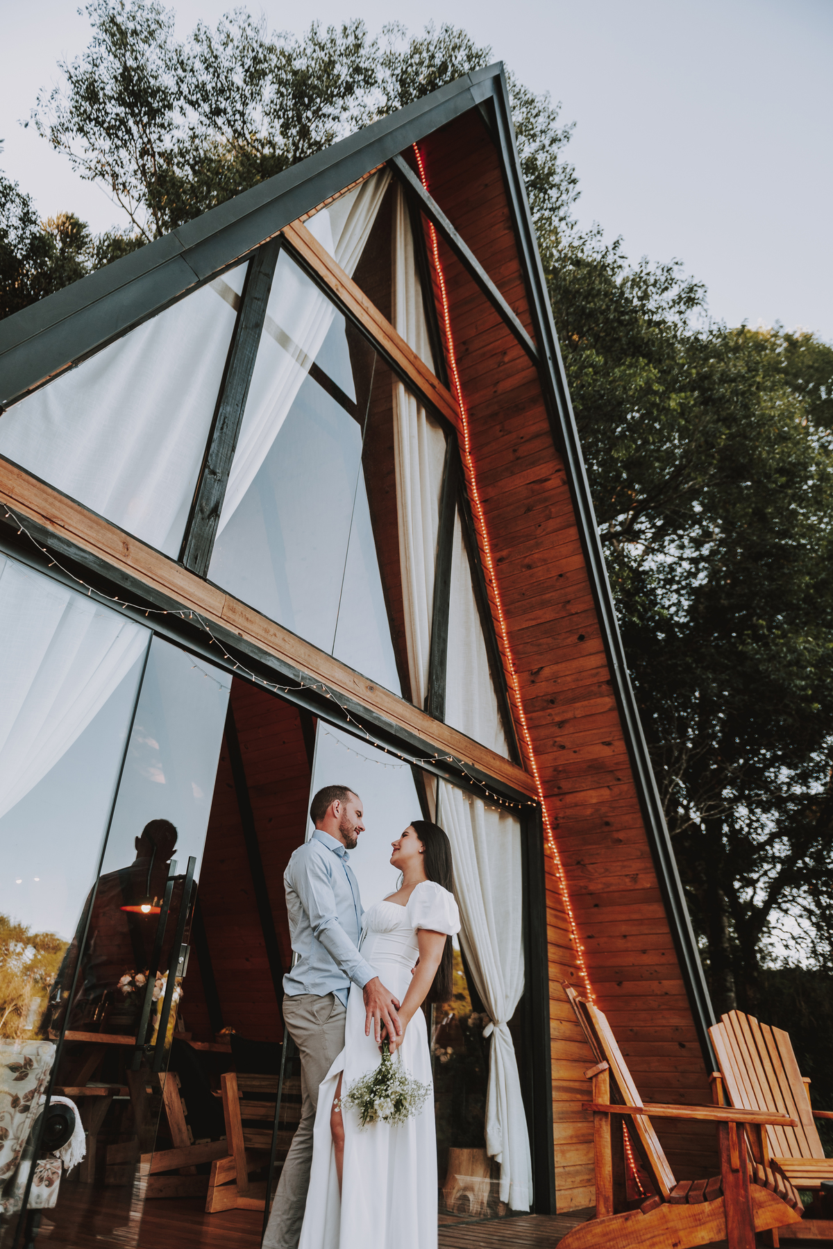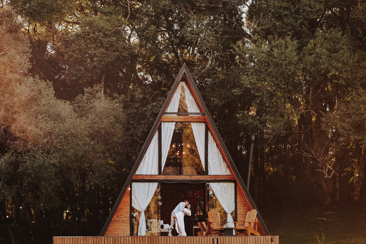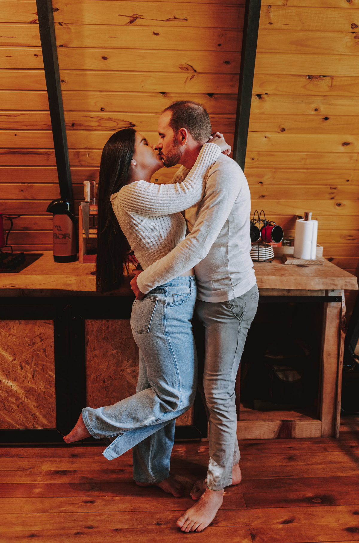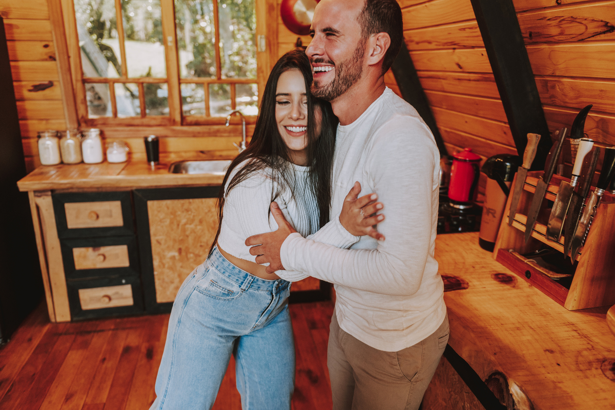 Eles escolheram como cenário a cabana que construíram juntos, com as próprias mãos e muitos sonhos. Um refúgio feito de madeira, fé e carinho. Ali, cada objeto tem história: os móveis esculpidos pelo Gabriel, os símbolos de religiosidade que decoram com leveza, os cantinhos que guardam memórias e significados. É mais que um lugar — é um espelho da vida que estão construindo lado a lado.