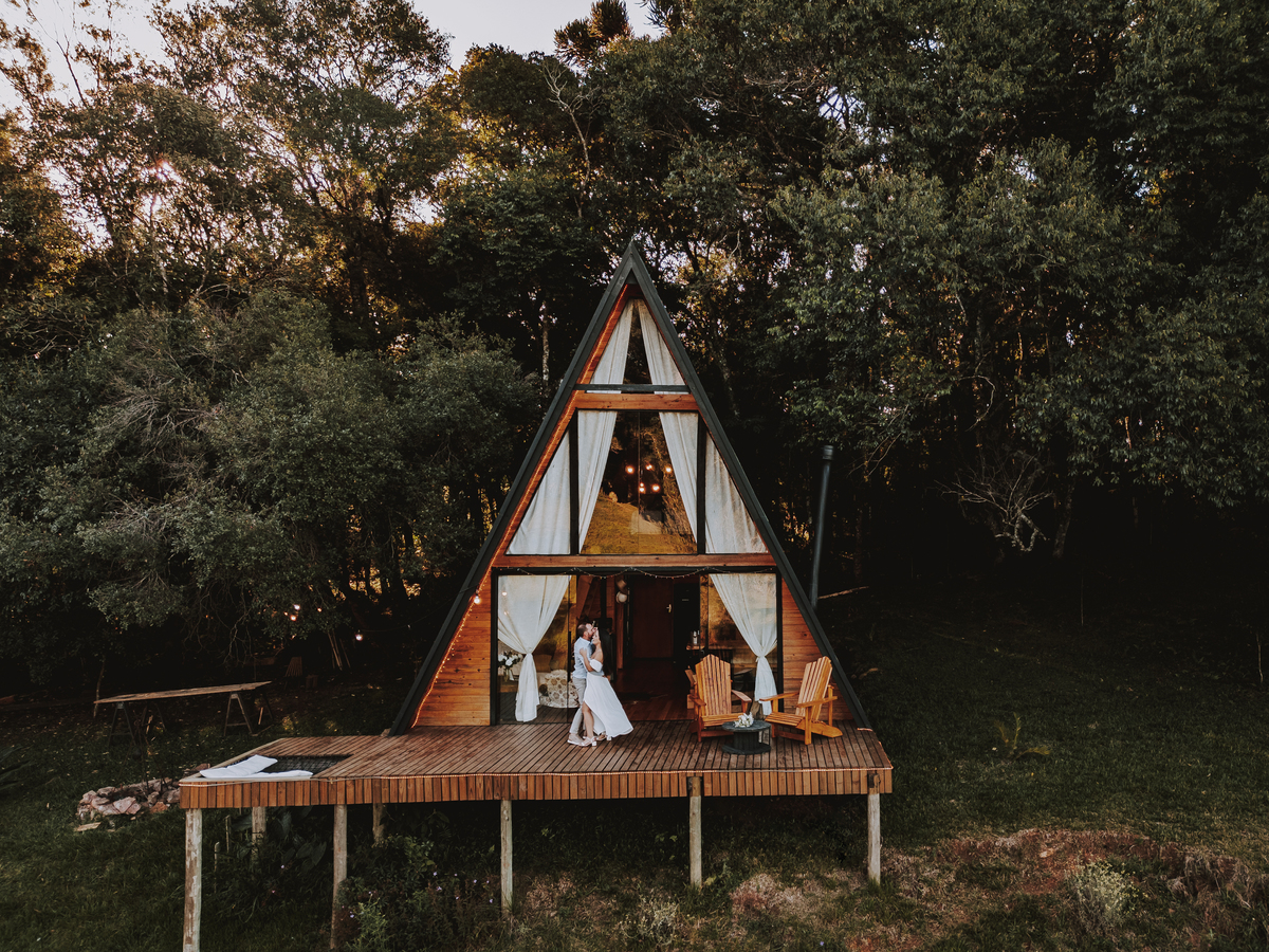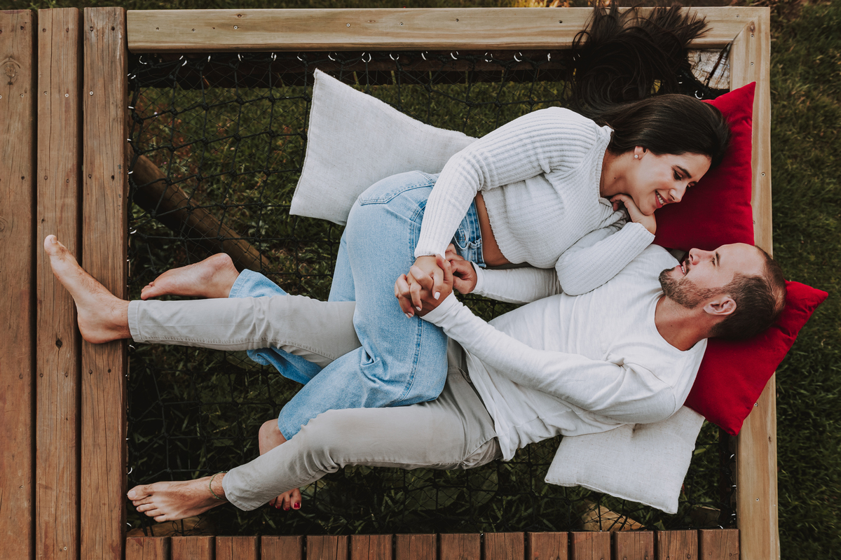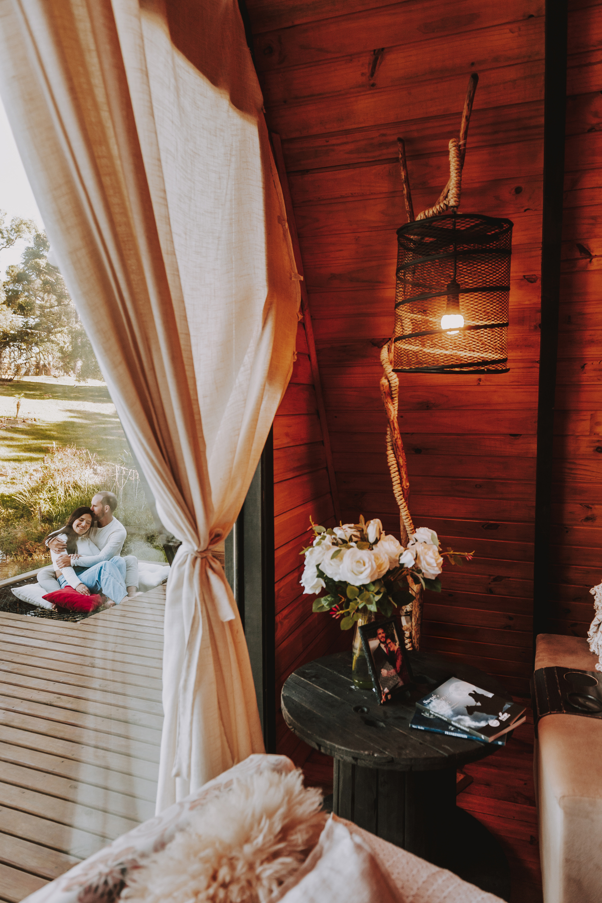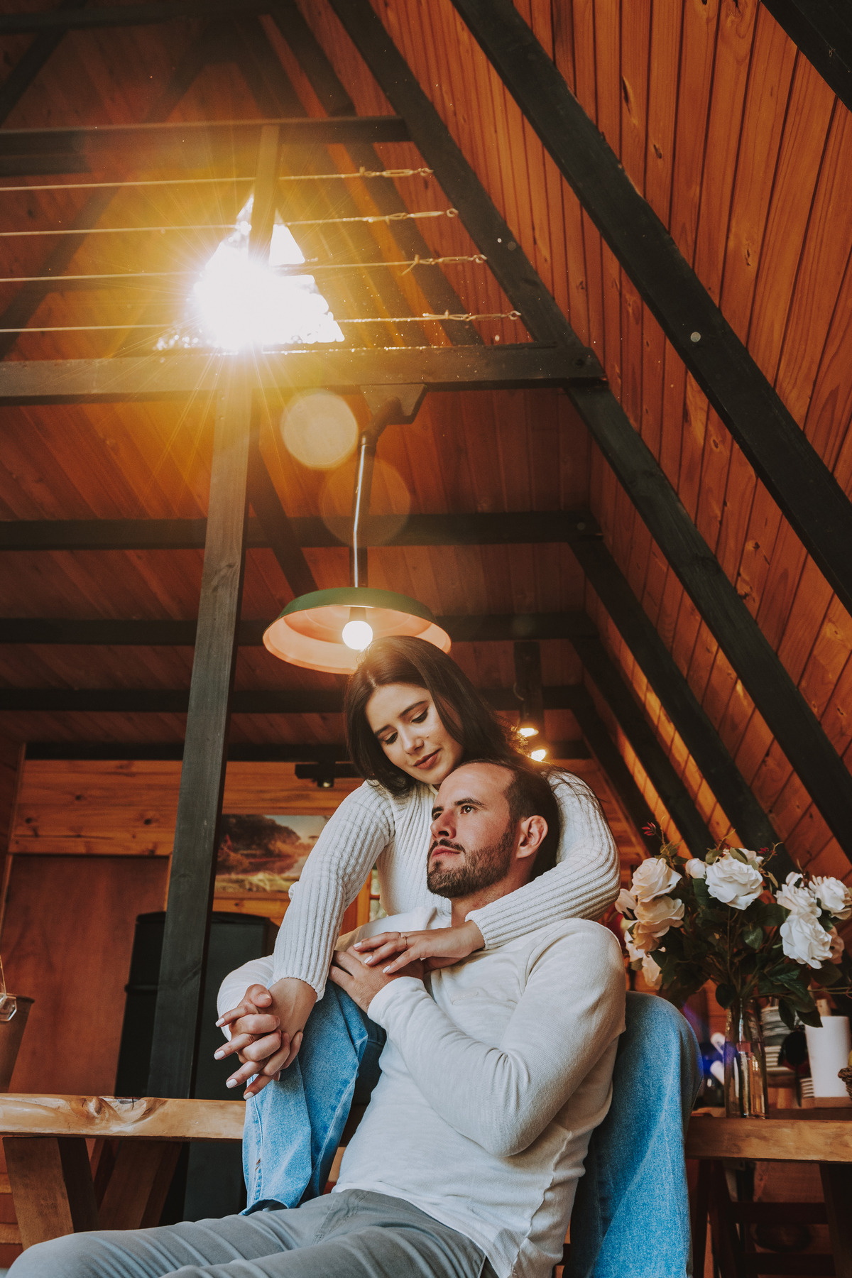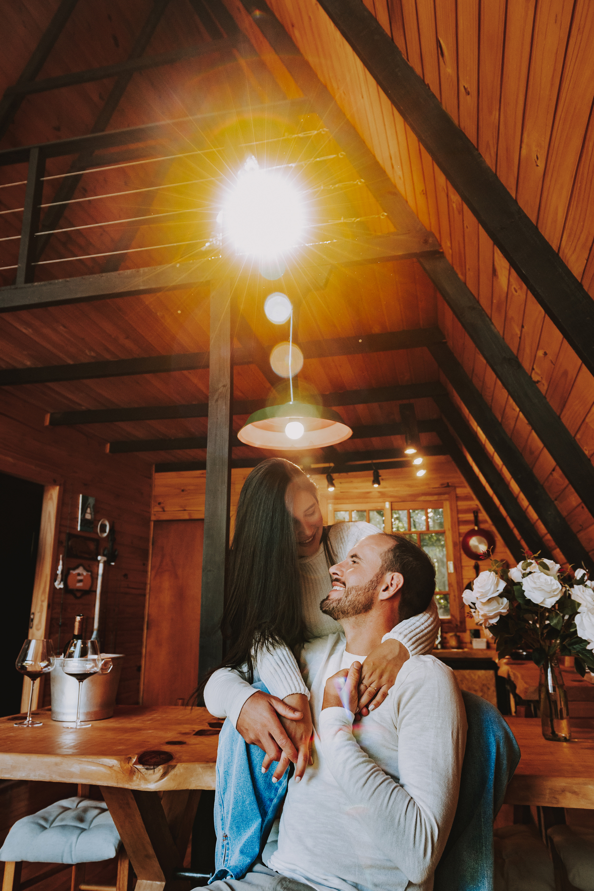 Eles escolheram como cenário a cabana que construíram juntos, com as próprias mãos e muitos sonhos. Um refúgio feito de madeira, fé e carinho. Ali, cada objeto tem história: os móveis esculpidos pelo Gabriel, os símbolos de religiosidade que decoram com leveza, os cantinhos que guardam memórias e significados. É mais que um lugar — é um espelho da vida que estão construindo lado a lado.