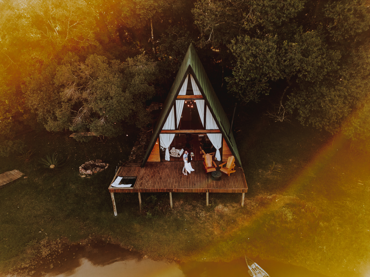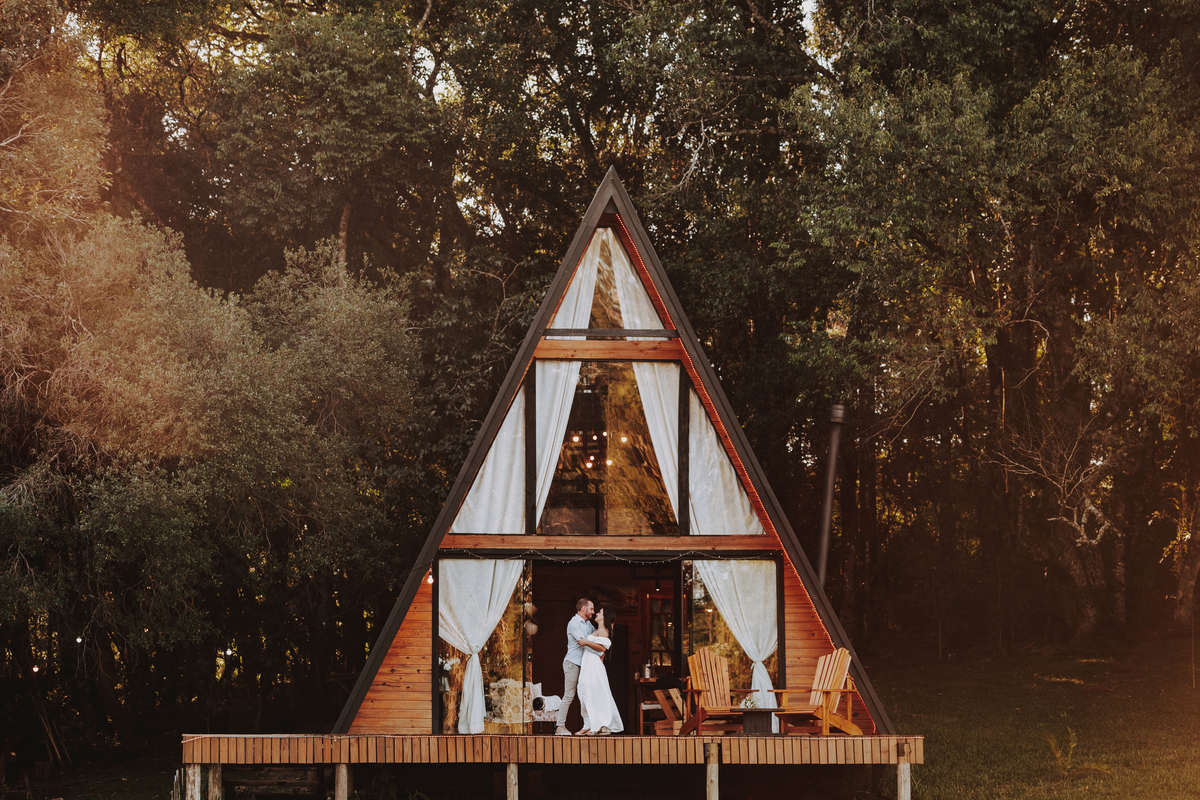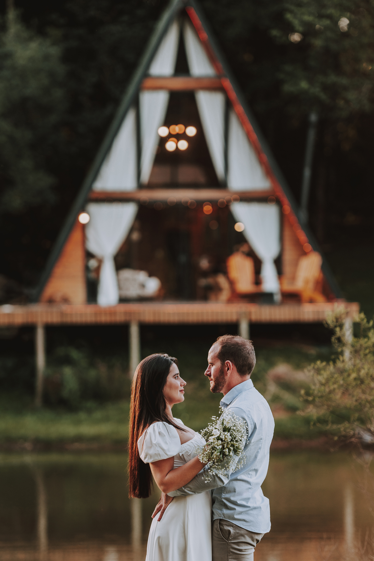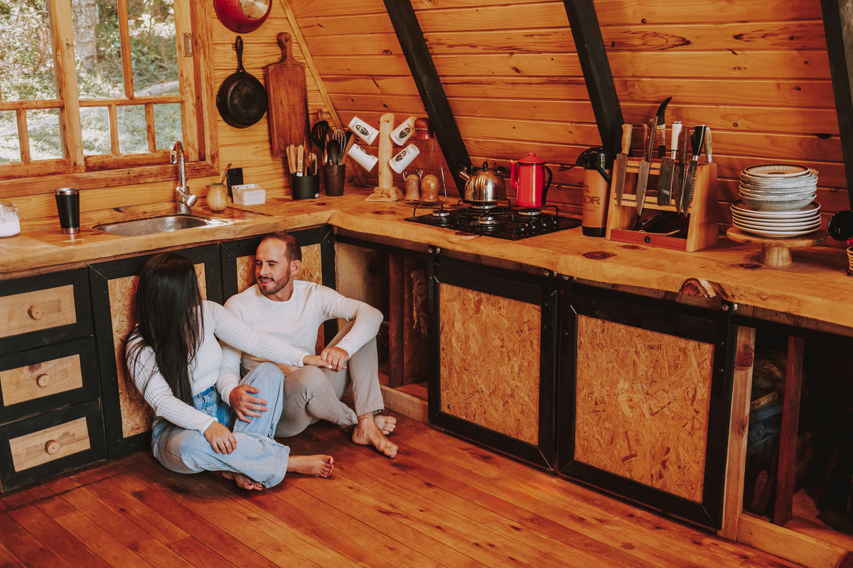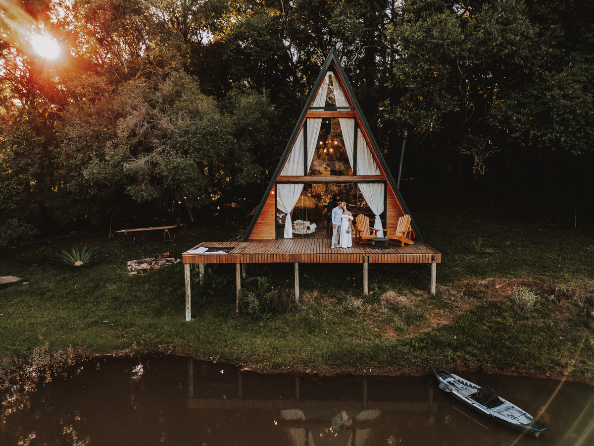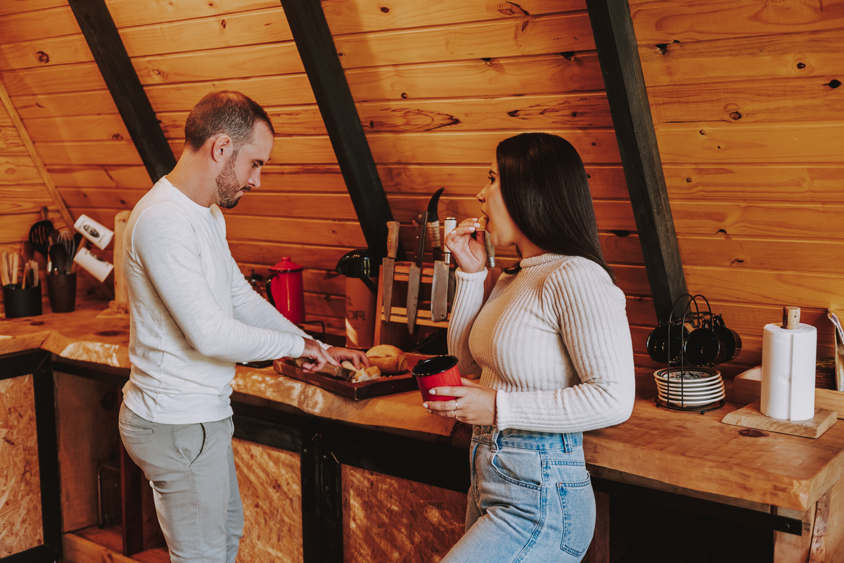 Eles escolheram como cenário a cabana que construíram juntos, com as próprias mãos e muitos sonhos. Um refúgio feito de madeira, fé e carinho. Ali, cada objeto tem história: os móveis esculpidos pelo Gabriel, os símbolos de religiosidade que decoram com leveza, os cantinhos que guardam memórias e significados. É mais que um lugar — é um espelho da vida que estão construindo lado a lado.