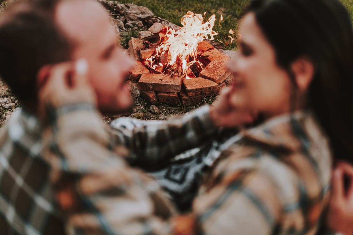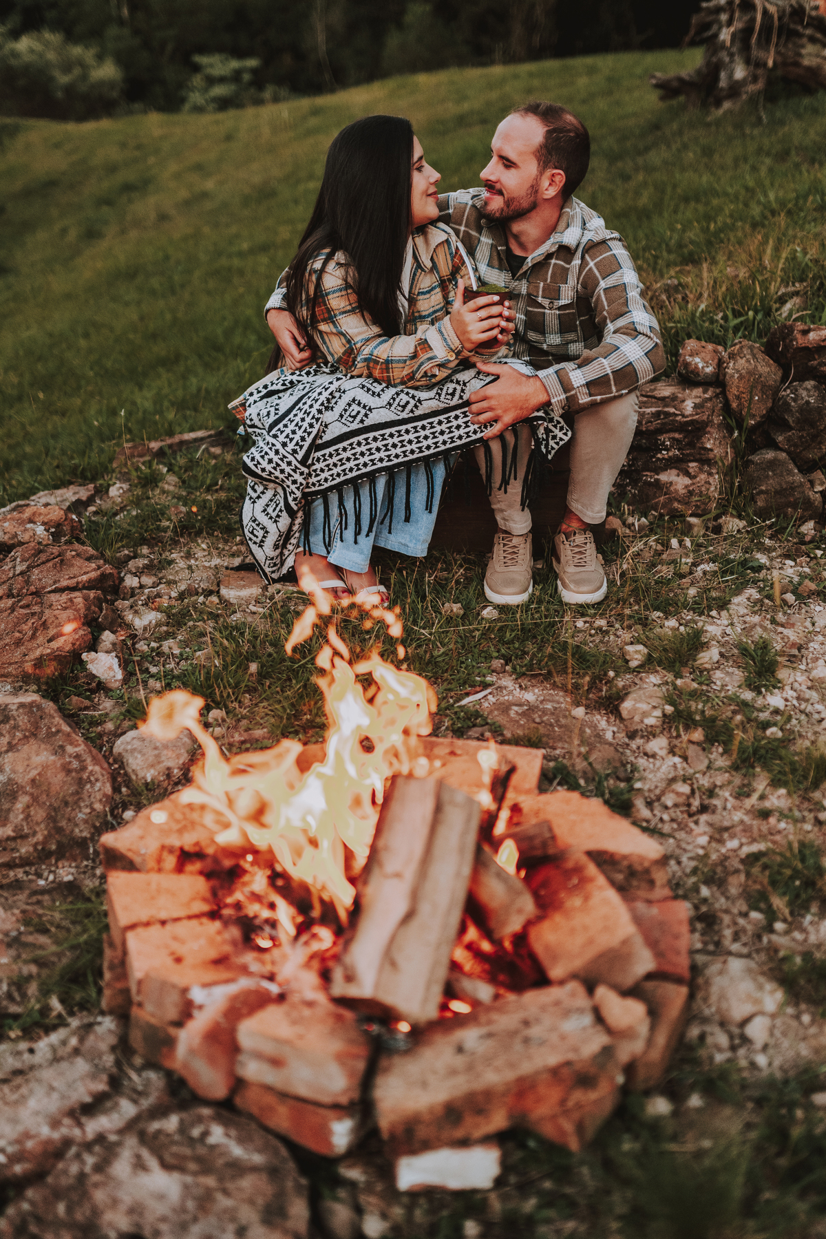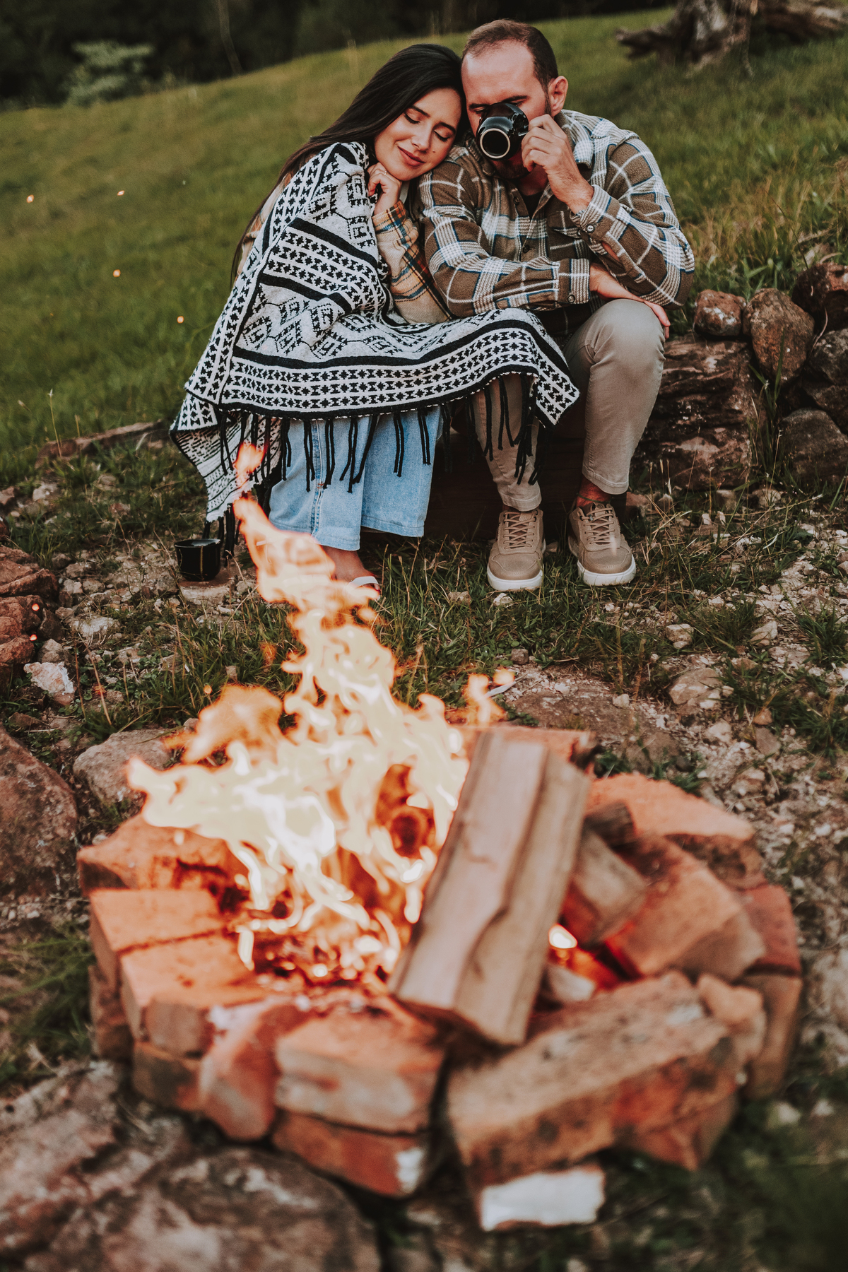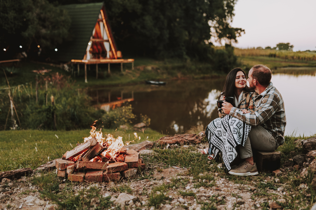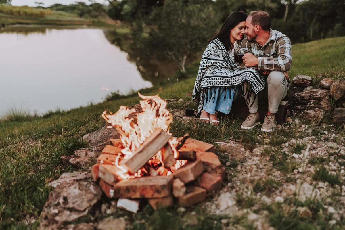 E como se o amor já não transbordasse o suficiente, ao final do ensaio eles acenderam uma fogueira. Sentaram-se juntos, envoltos pelo calor das chamas e da conexão entre eles. O céu escurecia devagar, o silêncio dizia tudo. Era como se o tempo tivesse parado só pra eles… pra celebrar o amor, a entrega, a beleza de viver o que antes era apenas sonho.